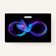 Symbole d'infinité violet brillant avec volant, colibri bleu lumineux sur arrière - plan noir. Fluorescent, fluo, fluos.