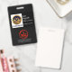 Un design de texture de tissu noir couvre la face de la carte et est accentué par une colonne noire près du haut de la carte. Ici se trouve une option de modèle de photo pour une taille de photo de 1 000 x 1 200 pixels. À côté de la photo figurent votre nom prestigieux, votre titre de poste et votre numéro d'employé. Ceci est suivi d'un logo de soins de santé rouge facultatif, du nom de l'organisation et des coordonnées électroniques près de la base.