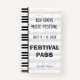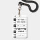 Cet insigne personnalisable d'événement pour la presse, l'artiste, des coulisses, VIPs ou accès public comporte un clavier de piano sur un fond de la vieille musique de feuille de manuscrit, imprimé sur les feuilles durables (taille 2,13" x 3,38") de plastique de PVC qui ne se fanera pas ou ne déchirera pas. Customisez le modèle comme passage pour l'accès à vos secteurs de festival ou d'événement. Attachés avec une agrafe de lanière ou en métal fournie comme frais supplémentaires facultatifs.
