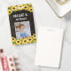 Badge d'identification vertical de tournesol personnalisé avec photo, nom et titre avec tournesols sur fond de grain de bois imprimé Badge d'identification d'enseignant de maternelle avec un thème de tournesol. Badge d'identification de thérapeute en art avec un look de tournesol rustique avec votre photo sur fond de grain de bois foncé et tournesols jaunes vifs.