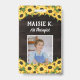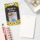 badge d'identification de tournesol vertical personnalisé avec photo, nom, et titre avec tournesol contre imprimé grain de bois d'enfant badge d'identification d'enseignant avec un thème de tournesol. badge d'identité du thérapeute artistique avec un look de tournesol rustique avec votre photo contre les grains de bois foncé et les tournesols jaune vif.