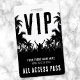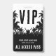 Concert Billet Tous Accès Special Événement Badge VIP. Ce badge VIP noir et blanc présente une silhouette audacieuse, parfaite pour un concert en plein air ou une fête avec une ambiance Coachella. Le devant représente une foule de concerts, les bras levés, entourés de palmiers, créant une atmosphère festive saisissante. "VIP" est affiché en haut dans une police en gras, avec le nom de l'événement, la date et "All Access Pass" placé en bas. La couleur arrière - plan peut être modifiée pour correspondre à votre thème, et toutes les couleurs de texte et de police sont entièrement personnalisables. Le verso est actuellement vide, ce qui vous donne de l'espace pour ajouter votre propre message, votre logo ou des informations supplémentaires sur l'événement si vous le souhaitez.