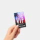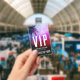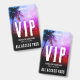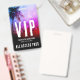 Ce badge VIP présente un design coloré et énergique, parfait pour un concert en plein air ou une fête avec une ambiance Coachella. En haut, un mélange éclatant d'oeuvres d'art bleu, rose, rouge et violet montre des silhouettes de convives et un palmier en haut à gauche, capturant cette sensation festive animée. L'image s'évanouit en noir en bas, où le nom de l'événement, la date et "All Access Pass" sont affichés dans des polices blanches propres, avec "VIP" en gras en haut. La même conception apparaît de part et d'autre pour un look poli et cohésif. Toutes les couleurs de texte et de police sont entièrement personnalisables, et vous pouvez mettre à jour l'image ou les couleurs en fonction de votre thème d'événement.