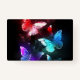 Trois papillons lumineux, rouges, violets, verts, texturés, nocturnes sur arrière - plan noir lumineux.