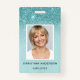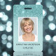Girly Aqua Turquoise Blue Professional Entreprise Nom du travail, photo et titre du travail Faux Parties scintillant et Sparkle Ombre ID Photo Insigne commercial vertical. Cette conception est simple et facile à utiliser en changeant votre prénom et votre nom ainsi que votre titre de travail et votre plan de tête d'entreprise.