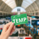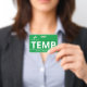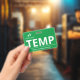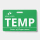 Badge temp vertical avec un design simple en blanc sur fond vert. Les grandes lettres propres facilitent la reconnaissance rapide du temp en tant que tel. Personnalisez avec le logo de votre entreprise.