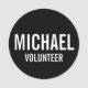 Black Volunteer Badge avec nom et titre en blanc gras sans serif police sur arrière - plan noir. Aussi parfait pour les stagiaires, l'équipage, le personnel, le groupe, l'équipe et plus.