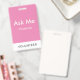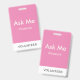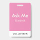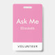 badge personnalisé "Ask Me" rose simple pour les bénévoles, les enseignants, les guides, les organisateurs d'événements spéciaux, tels que les mariages, les foires artisanales, les salons de la maison et du jardin, les événements caritatifs, les réunions d'affaires et les réceptions corporatives. "Demandez-moi" et Nom sont une couleur d'ivoire. Le titre "Volontaire" est gris foncé.