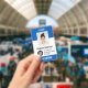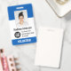 Badges personnalisés pour bénévoles avec nom, logo de l'entreprise, photo, code-barres ou code QR, avec pince ou cordon, dans des couleurs bleu clair et blanc vives.