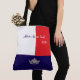 This cute stylish large tote bag is shown in a red, white and blue color block style with a silver pageant crown known as the afterglow series. Custom text.