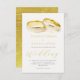 Une élégante invitation avec des anneaux mariages donnant à l'invitation une atmosphère très traditionnelle. Les anneaux sont sur un simple arrière - plan blanc avec la typographie dans une police moderne. La police est de nouveau en noir simple. Un bar de couleur or souligne le mot mariage. Le verso de l'invitation est de couleur or. L'invitation est facilement personnalisable à vos informations.
