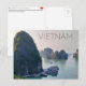 Envoyez cette belle carte postale à vos proches représentant des bateaux de tourisme en bois traditionnels amarrés au pied d'un karst calcaire imposant dans les eaux émeraude de la baie d'Halong,