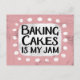 "Baking Cakes Is My Jam" est un design de texte mignon en rose avec du texte en noir, avec une forme d'accent blanc et des points blancs texturés blancs qui l'entourent.