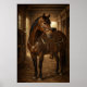 Un cheval sellé se tient tranquillement à l'intérieur d'une grange rustique tandis que la douce lumière du matin filtre à travers les fenêtres. Cette œuvre d'art occidentale chaleureuse capture l'anticipation calme d'une première balade et la beauté intemporelle de la vie de ranch.