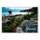Un tableau numérique d'un aigle chauve perché sur un bois flotté lavé sur la côte rocheuse de l'Alaska; des montagnes se dressent au loin. Le texte "Alaska" apparaît également.