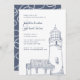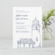 L'invitation à la fête de fiançailles chic côtier comporte une illustration de phare dessinée à la main de style vintage en bas à droite, avec les détails de votre fête de fiançailles en bleu marine classique. Parfaits pour les fêtes de plage, d'été ou de fiançailles nautique, ces invitations de style côtier renversent vers un motif de corde nautique en blanc sur le bleu du port.