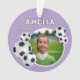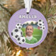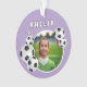 Ornement Photo Sport De Football De Football De Football Violet. Ornement avec des boules de football, un nom et une photo dans un cadre rond sur un arrière - plan violet pâle. Bon séjour pour un joueur de football ou un fan de football.