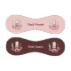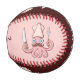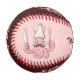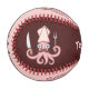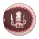 Caricature du chef calmar rose avec moustache tenant couteau et fourche à cuisine. Couleur arrière - plan personnalisée. Texte personnalisé des deux côtés.
