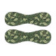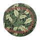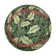 Un imprimé feuillage avec un feuille vert clair presque olive ou sage entrelacé dans des verts plus foncés. Une ombre de vert chasseur ou de vert foncé de forêt crée la grande majorité des feuilles. Sur un arrière - plan de noir.