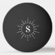 Boule de ping-pong noire avec votre monogramme initial à l'intérieur d'une bordure de points radiaux ressemblant à un soleil.