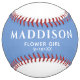 Offrez à votre fille d'honneur un cadeau de mariage unique qu'elle appréciera. Cette base-ball bleue et blanche porte son rôle "Fille de fleurs" et son nom en blanc moderne sur fond bleu. "Merci" au dos de la balle en texte vert sur fond blanc. Parfait pour un cadeau de demoiselle d'honneur ou de témoin également.