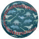 Beaucoup de dinosaures bleus, Tyrannosaurus rex, Spinosaurus, Stegosaurus, Diplodocus et Tricératops sur un arrière - plan vert turquoise foncé. Art original de Nic Squirrell.