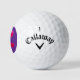 Callaway Golf Warbird Distance =optional, =(3 Pack of Golf balls), with a picture of a yellow tulip, triple pink roses, personalize= "Name"=medium green text, a red tulip, a White and Yellow Daffodil, pink rose#4, reduced in size, with the background removed, and a Dark Purple color, background added all over= (Pictures by P.J.M.) on it.
