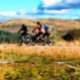 Une aquarelle a de trois hommes VTT dans les collines galloises.