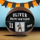 Custom Black Happy Birthday Photo Basketball. Design d'anniversaire avec texte d'anniversaire heureux, nom personnalisé, âge, année et photo. Customisez l'âge, nommez et ajoutez votre photo. Vous pouvez customiser ou effacer n'importe quel texte sur le basket-ball. Grand cadeau d'anniversaire pour un joueur de basket ou un fan.