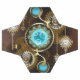 Turquoise lenses with antique watch with brass gears and golden keys on rusty, brown background. Steampunk style.