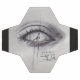 L'oeil lui-même est méticuleusement dessiné, avec un ombrage complexe qui capture la texture de la peau autour, les cils et l'iris. L'élève, cependant, contient un élément frappant et imaginatif : une petite figure silhouette d'une personne qui monte, comme si elle était piégée ou en difficulté dans l'oeil.