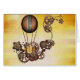 Balloon Steampunk avec panier et engrenages en forme de molleton sur un arrière - plan ancien de motif rayé jaune/orange.