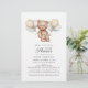 Ballons Ours Mignons Script Baby shower Invitation. Carte d'invitation baby shower neutre et tendance, avec un bébé ours avec ballons. Parfait pour les baby showers garçons et filles.