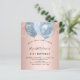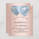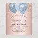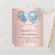 Pour un 21e anniversaire élégant (ou à tout âge). Un fond métallisé faux rose gold. Décoré de gouttelettes de paillettes roses, d'un effet de peinture qui goutte et de ballons bleus. Personnalisez et ajoutez un nom, 21 ans et les détails de la fête. Le nom est écrit avec une police de caractères manuscrite. Lettres de couleur bleu marine