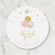 Ajoutez ces étiquettes de remerciement modernes et mignonnes à vos faveurs de fête. Ce modèle d'étiquette présente des confettis, des ballons et une typographie élégants dans un thème de couleurs or et rose. Parfait pour un anniversaire moderne ou une baby shower pour une fille. Les invitations et les fournitures de fête assorties sont disponibles dans ma boutique BaraBomDesign.