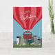 Une montgolfière attachée devant une carte d'anniversaire de la ville.