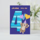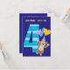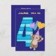 C'est un design coloré d'invitation de fête d'anniversaire, avec une image rayée bleue et turquoise numéro quatre, et un mignon singe brun dans un casquette d'anniversaire et tenant des ballons devant lui. Le haut de l'invitation dit (Nom) sera (quatre). L'image et le texte sont placés sur un arrière - plan violet brillant. Le dos de la carte est le même violet, avec vos informations de fête en blanc. Merveilleux pour la fête du quatrième anniversaire de votre enfant! *Merci à Real Deal Clipart pour le clipart utilisé pour créer ce design.