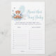 Entrez dans un monde de charme adorable avec notre "Teddy Bear Blue Balloons That Song Boy Baby shower Game", un design qui saisit l'essence de la douceur de l'enfance et la joie d'accueillir une nouvelle vie. Au coeur de ce design, un ours en peluche aquarellisé prend le devant de la scène, accrochant trois ballons bleus derrière son dos avec un air de secret ludique. C'est une scène attachante qui incarne la joie et l'émerveillement d'accueillir un bébé précieux dans le monde. Sous les pattes de l'ours, un lit de fines fleurs bleues se déploie comme un pré tranquille. Chaque fleur est un témoignage de la beauté de la nature et de l'amour doux et nourrissant qui entoure l'arrivée imminente d'un petit garçon précieux. La palette de couleurs est un doux mélange de bleu doux et de marron terreux, créant une atmosphère sereine et tranquille. Ces teintes ont ouvert la voie à une célébration remplie d'amour et de promesses de nouveaux débuts. Il promet un rassemblement rempli de rires, de conversations sincères et d'anticipation joyeuse d'un petit précieux. Éléments correspondants disponibles.