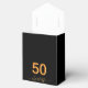 Elégant, classique, glamour et girly pour une fête de 50ème anniversaire. Un arrière - plan noir chic. Décoré avec des gouttes de parties scintillant en faux or, la peinture goutte à goutte. Personnalisez et ajoutez un nom. Avec le texte : Merci plus le nom des filles d'anniversaire. Le nom est écrit avec un script de style manuscrit moderne de couleur dorée avec des swashes. Le numéro 50 est écrit avec une police de style ballon. Pour que les swashes ne suppriment que le nom de l'échantillon, laissez les espaces ou émoticônes devant et après le nom.