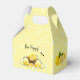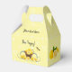 Cet adorable design ballotin est orné d'un motif arrière - plan jaune et blanc. Sur les panneaux avant et arrière, il y a un panier en osier marron rempli de citrons. Le texte dit "Heureux !", avec une petite abeille. Les panneaux latéraux comportent deux citrons entiers et la moitié d'un citron. Tout le texte peut être customisé.