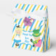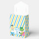 Cute Alice in Wonderland boîte de faveur pour un anniversaire à thème livre. La petite fille Alice dans sa robe bleue et le chapeau Mad dans une tasse sur une jolie frontière bleue sur un bébé lunatique bleu et jaune rayé motif. Customisez avec votre propre texte pour une fête du thé pour enfants.