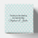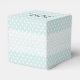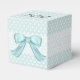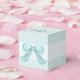 Jolie boîte cadeau de mariage fait dans une aquamarine avec des pois blancs. Des graphismes d'un ruban blanc dentelé, court autour du milieu de la boîte et un arc en satin aquamarine, décorent l'avant. Personnalisez le texte noir, sur le rabat du couvercle, pour votre occasion. Grande comme les boîtes de faveur de mariage, anniversaires et douches.