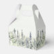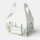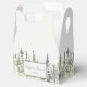 Ces boîtes de faveurs ou de soins sont des forfaits parfaits pour les faveurs de mariage pour votre chalet de montagne ou mariage à thème boisé. Elles ont un style simple mais élégant avec un accent illustrant une forêt de pins de grande taille ou à feuillage persistant dans les tons vert sauge, gris et vert pâle. L'aquarelle douce a une qualité calme et paisible, qui vous rappellera que le brouillard se lève sur un vitrage boisé. Le lettrage classique et élégant dans un vert à la sauge foncée coordonné indique les noms de la mariée et du marié et la date du mariage.