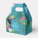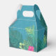 Boîte de faveur de mariage de style pignon colorée représentant un toucan audacieux perché parmi des fleurs d'hibiscus et des feuilles de palmier peintes à l'aquarelle. Le motif de fond répétitif à feuilles de palmier est facultatif et peut être changé en blanc si vous le préférez. Le texte manuscrit 'Amour et remerciements' ainsi que les noms des mariés et la date du mariage sont également facultatifs sur le rabat supérieur. Ces faveurs tropicales sont parfaites pour les mariages d'été, de plage et tropicaux, les anniversaires et autres événements. Recherchez l'ID577 pour voir les produits assortis.