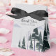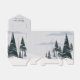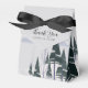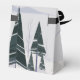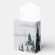 Une scène hivernale charmante d'une forêt enneigée de sapins et d'épicéas vert foncé et d'un ciel gris pâle orne cette boîte de faveurs de fête de fin d'année pour un mariage ou un gala de Noël. Ce dessin moderne d'un paysage naturel enneigé est parfait pour une soirée de décembre ou janvier.