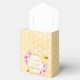 Un ballotin pour un Baby shower d'été, célébrant une petite fille.. Arrière - plan jaune avec un motif de nid d'abeille. Avec un cadre géométrique en faux or. Décoré de fleurs de fleurs tropicales roses, d'hibiscus et d'abeilles souriantes joyeuses. Avec le texte : Merci et Maman à Bee écrit avec un script de style moderne écrit à la main. Personnalisez et ajoutez le nom de la mère au nom de l'abeille et la date de la douche. Lettres roses, vertes et marron.