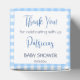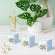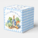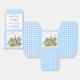 Peter lapin avec une veste bleue et baby shower de légumes du jardin favorise un modèle ballotin personnalisé. Un mignon lapin dans une veste bleue debout dans le jardin végétarien pour un bébé garçon baby shower pastel bleu en vichy ballotins convenant pour bonbons amandes faveurs noix, peut accueillir environ 20 amandes couchées