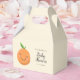 Carte de ballotin baby shower mignonne avec l'illustration d'une mandarine orange avec un doux sourire rougissant sur un arrière - plan jaune. Parfait pour un baby shower neutre pour les femmes.