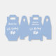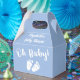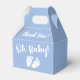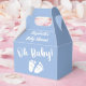 Un mignon ballotin de douche pour bébé avec "Oh Baby !" dans un script blanc, une aquarelle blanche de pieds bébé, et le nom de la future mère en écriture blanche, le tout contre un arrière - plan bleu pastel clair.