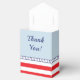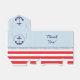 Ces ballotins de baby shower à thème nautique disposent d'une ancre patriotique décorée d'étoiles et de rayures. L'Arrière - plan est bleu clair avec une garniture de corde nautique et une bordure rayée rouge et blanc. "Merci !" est sous le rabat avant et l'exemple de texte "Baby shower de Béthanie" est écrit au-dessus de l'ancre sur le dos pour vous permettre de personnaliser.